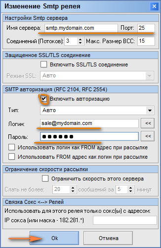 В появившемся окне "Изменение Smtp релея" заполняем следующие поля: