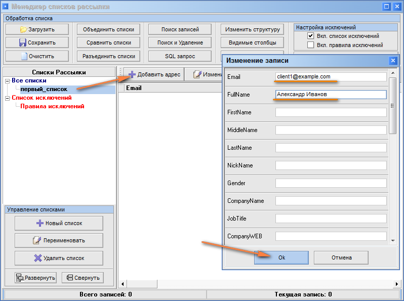 Убедитесь, что в левой части окна выделен список рассылки "первый_список" и нажмите кнопку "Добавить адрес". В появившемся окне "Изменение записи" заполните поля "Email" и "FullName". По окончанию нажмите "Ок". Первый адресат внесен в наш список рассылки. Вы можете повторить эти действия для добавления других адресатов. Теперь наш список рассылки выглядит так: