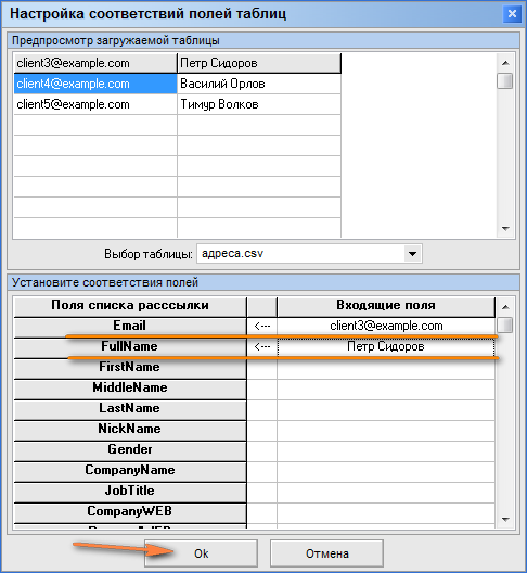 Ищем наш файл на Рабочем столе в папке Клиенты и жмем кнопку "Открыть". Теперь перед нами окно выбора параметров Импорта записей: