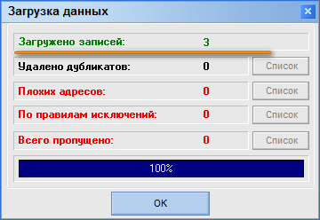 В верхнем поле окна - наши данные из файла. В нижнем необходимо выбрать соответствие полей в файле полям в нашем списке рассылки, как это показано на скриншоте выше (Поля списка рассылки - Входящие поля) и нажать кнопку "Ок". Программа выдает нам окно с результатами Импорта - импортировано три записи, ошибок нет: